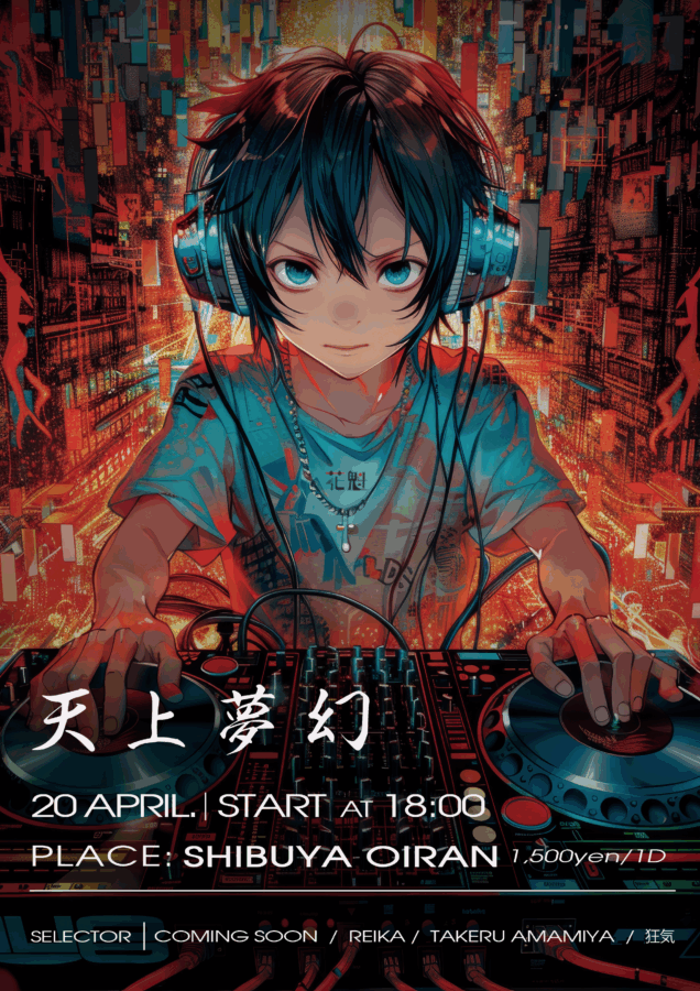 天上夢幻 spring party 2025Y 4/20 Sun. 18:00~ place: 渋谷花魁 SHIBUYA OIRAN 東京都渋谷区道玄坂2-22-6 Entrance fee:1000en DJ takeru amamiya coming soon 狂気 Reika Boat-nenkai Final 2018年12月15日 hakoniwa Lounge-La Fabrique (ラ・ファブリック) 2003年4月28日 箱庭@JzBrat. 2005年9月15日